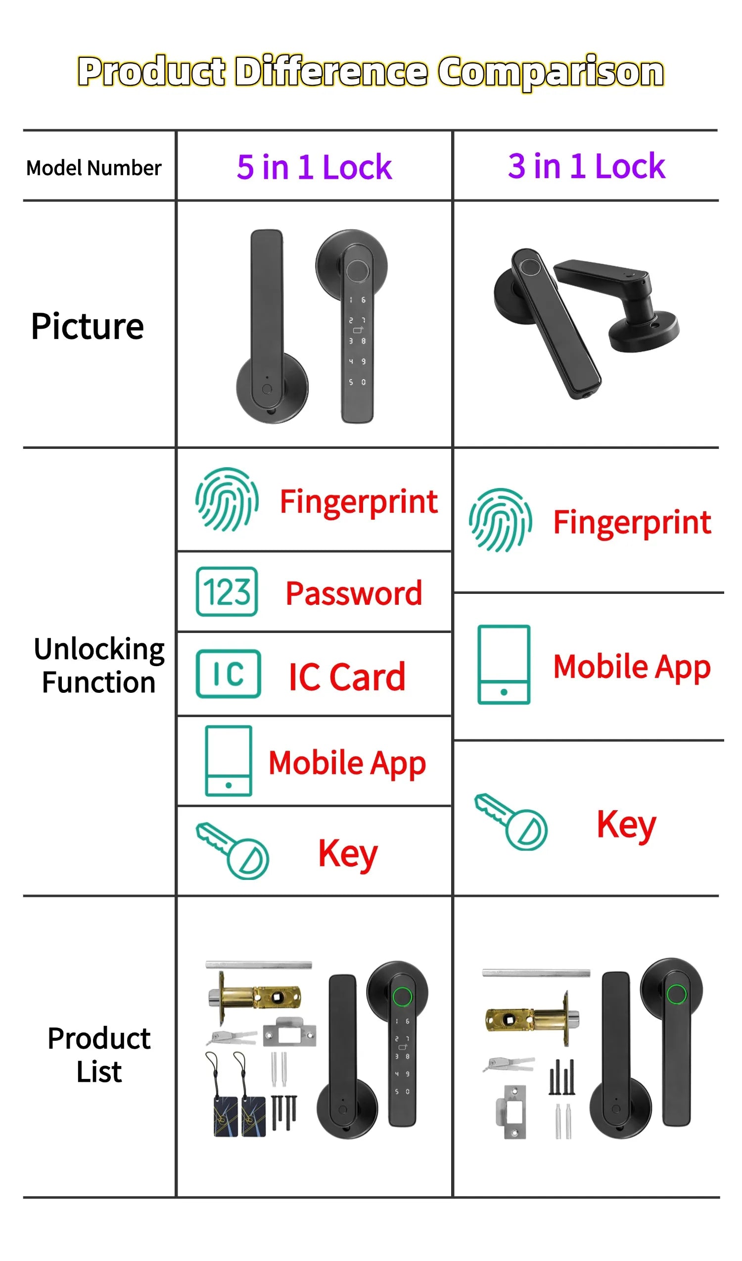 Tryb odblokowania (blokada 5 w 1): odcisk palca / hasło / karta IC 13,56 MHz / klucz mechaniczny (2 szt.) / aplikacja Tuya (Bluetooth)